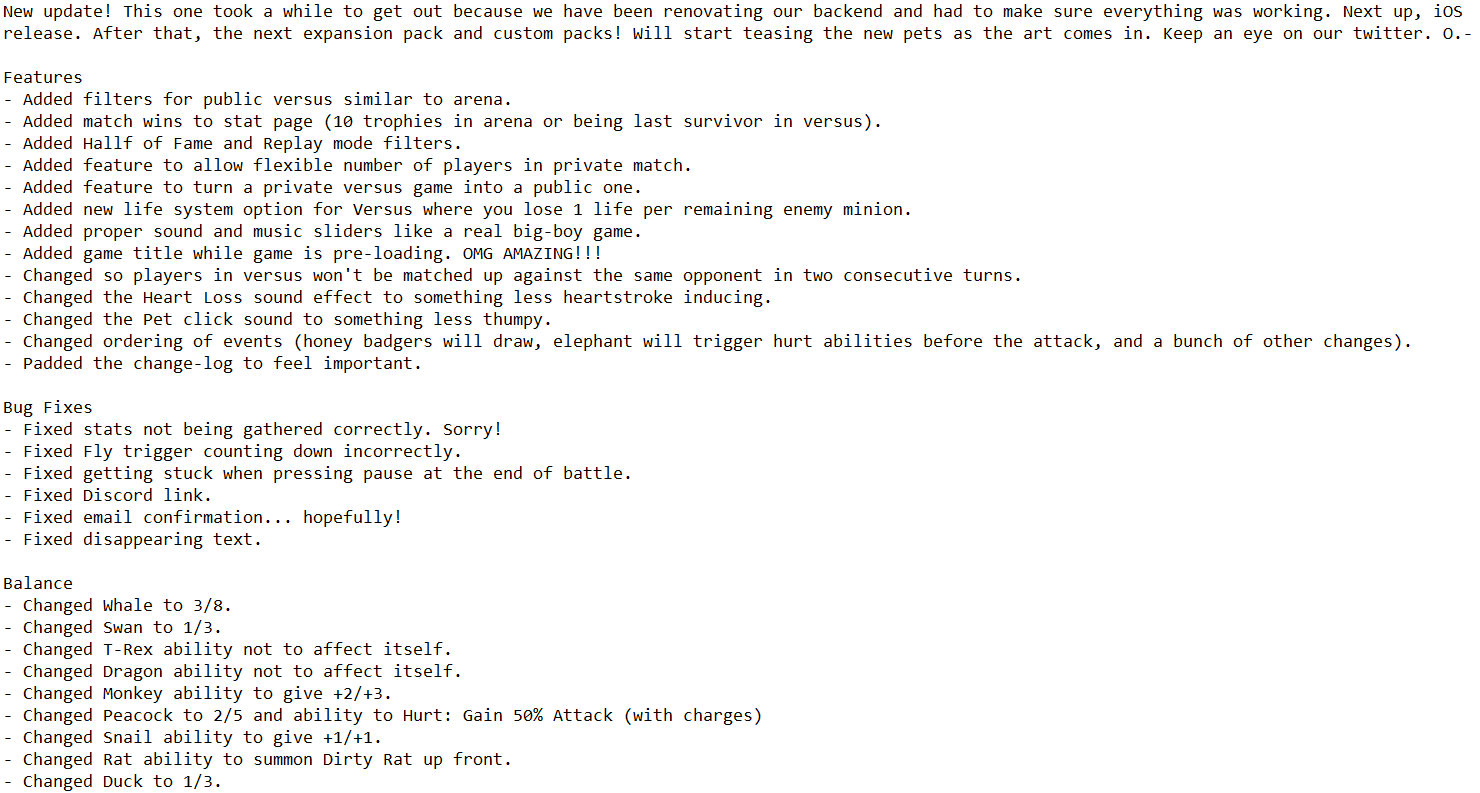 This one took a while to get out because we have been renovating our backend and had to make sure everything was working. Weekly packs are generated every Monday and contain a completely random set of pets for everyone to play with. Try to consider this when building your team.